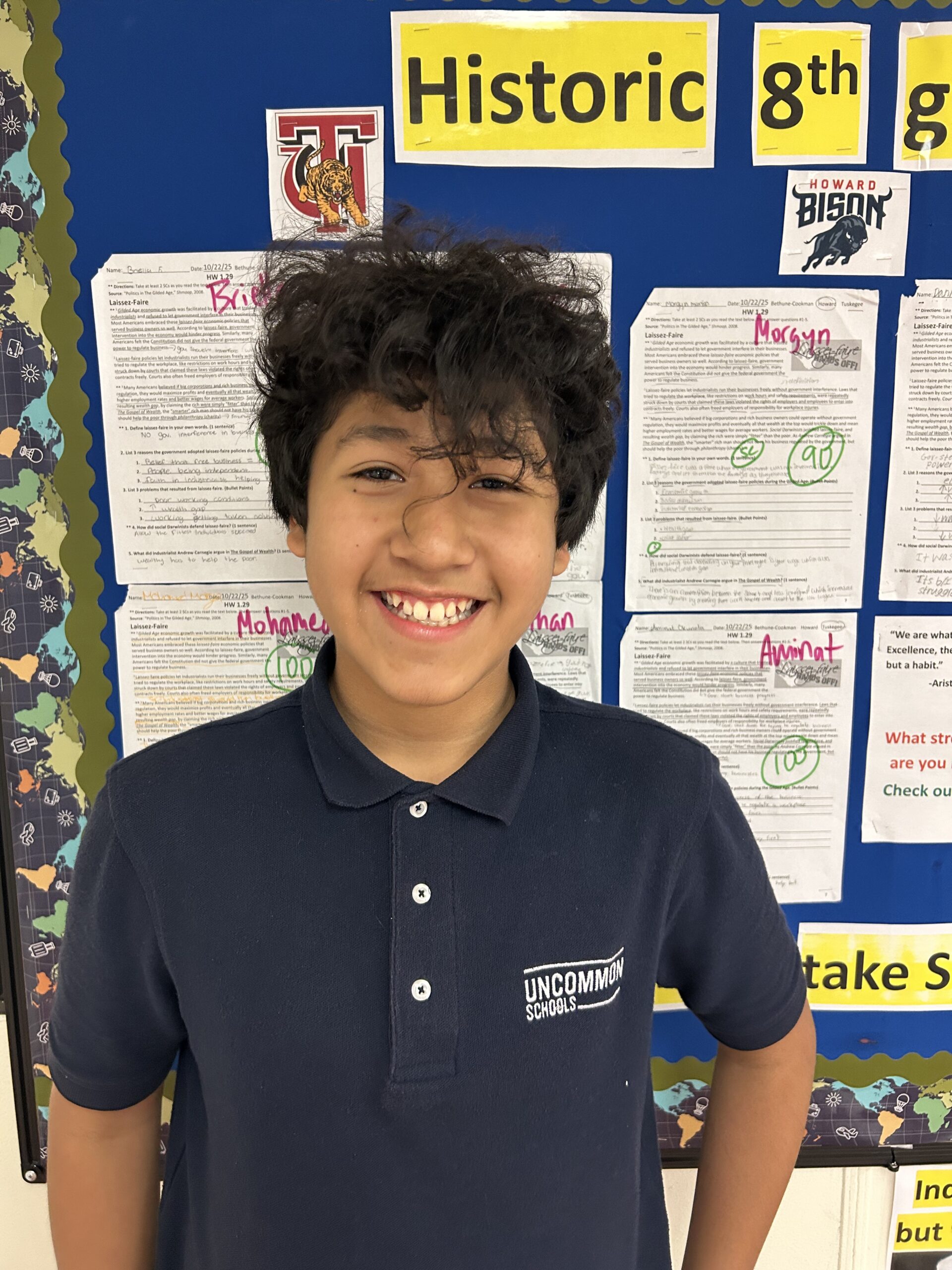 My name is Jonathan Marcano. I have two sisters. Everyone thinks they are twins, but they are actually one year apart. I am also bilingual, and my favorite book is March by John Lewis because of its powerful and authentic retelling of the Civil Rights Movement. I want to grow up to be a professional soccer player, but if that doesn’t work I want to be a lawyer. My mom and dad are my heroes because they work really hard even if they’re tired and help me when I’m sad or down, which means a lot to me.